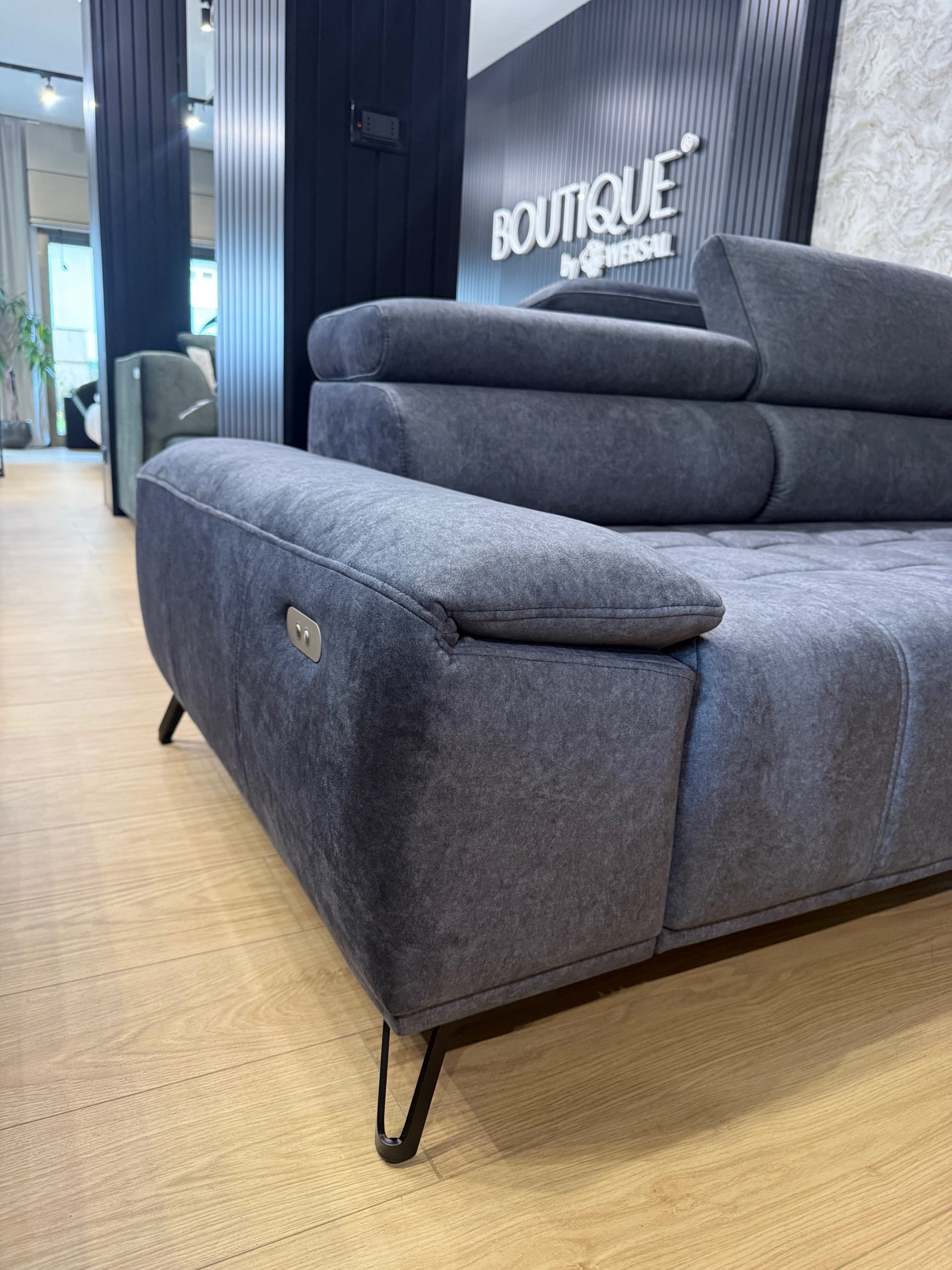 Dal punto di vista estetico, il divano colpisce per i suoi dettagli ricercati: cuciture decorative e lacci eleganti donano carattere e movimento alla struttura, rendendolo un elemento centrale del soggiorno. Il colore grigio acciaio è versatile e sofisticato, facilmente abbinabile a diversi stili d’arredo, dal minimal al moderno.