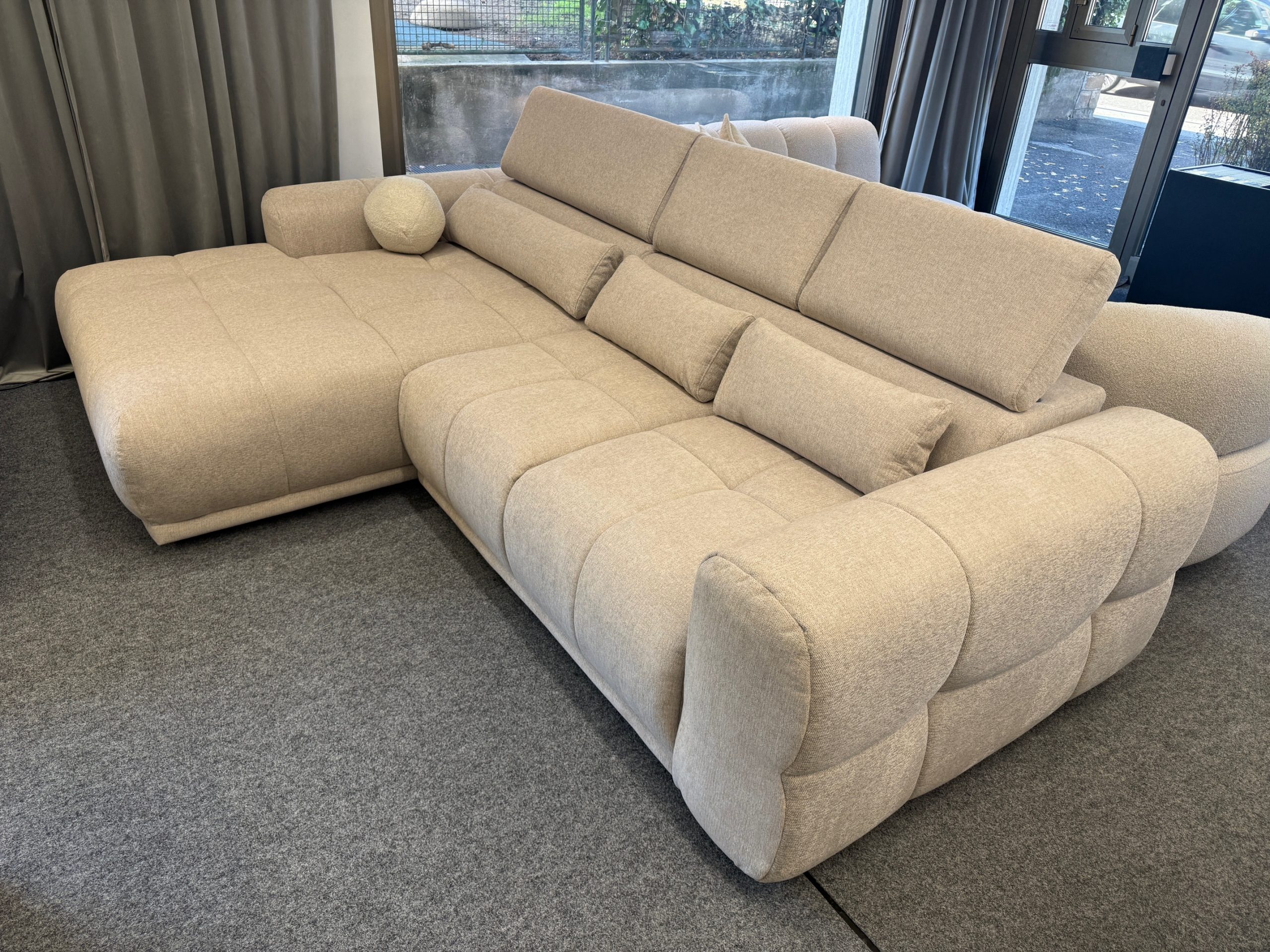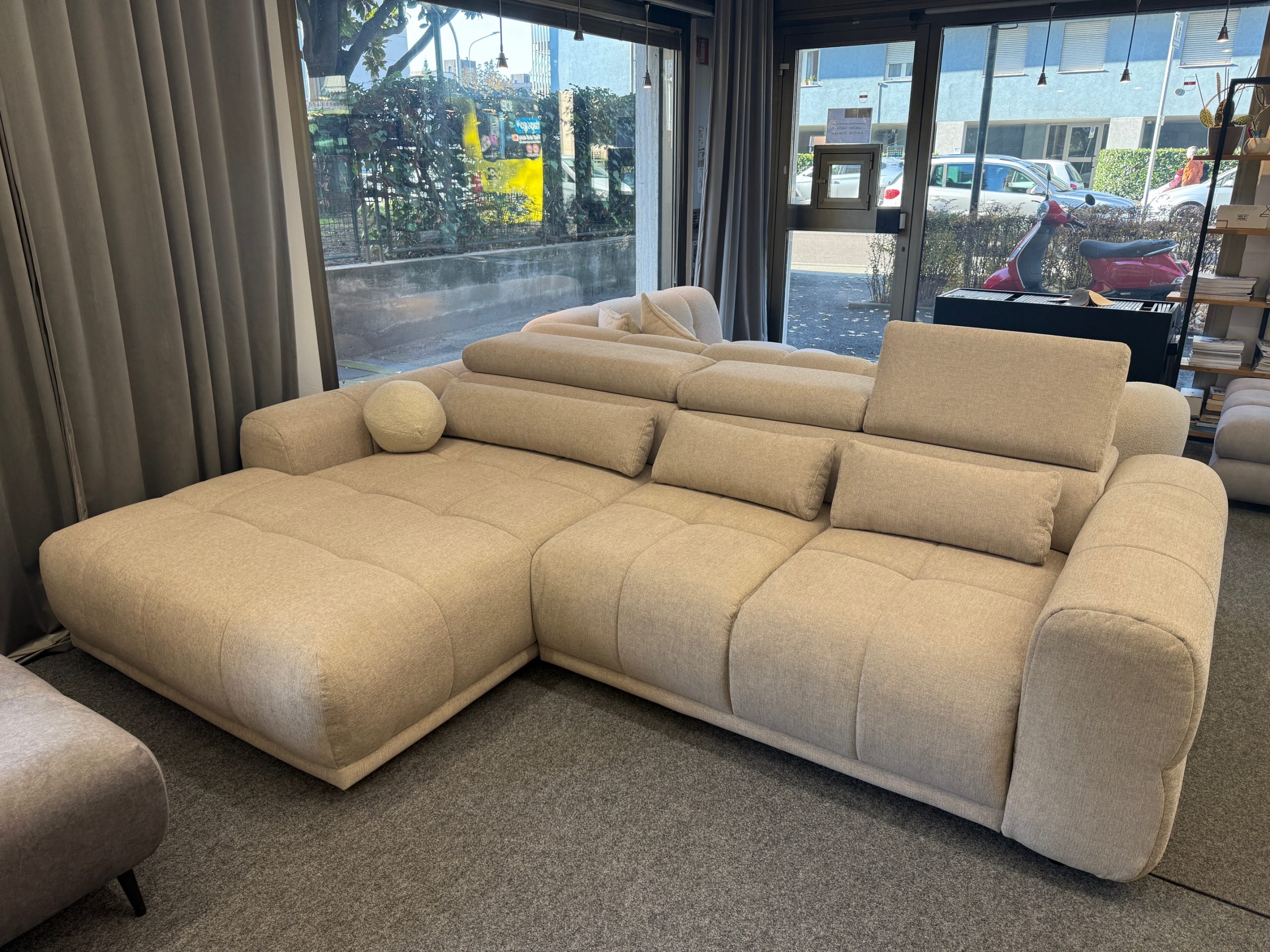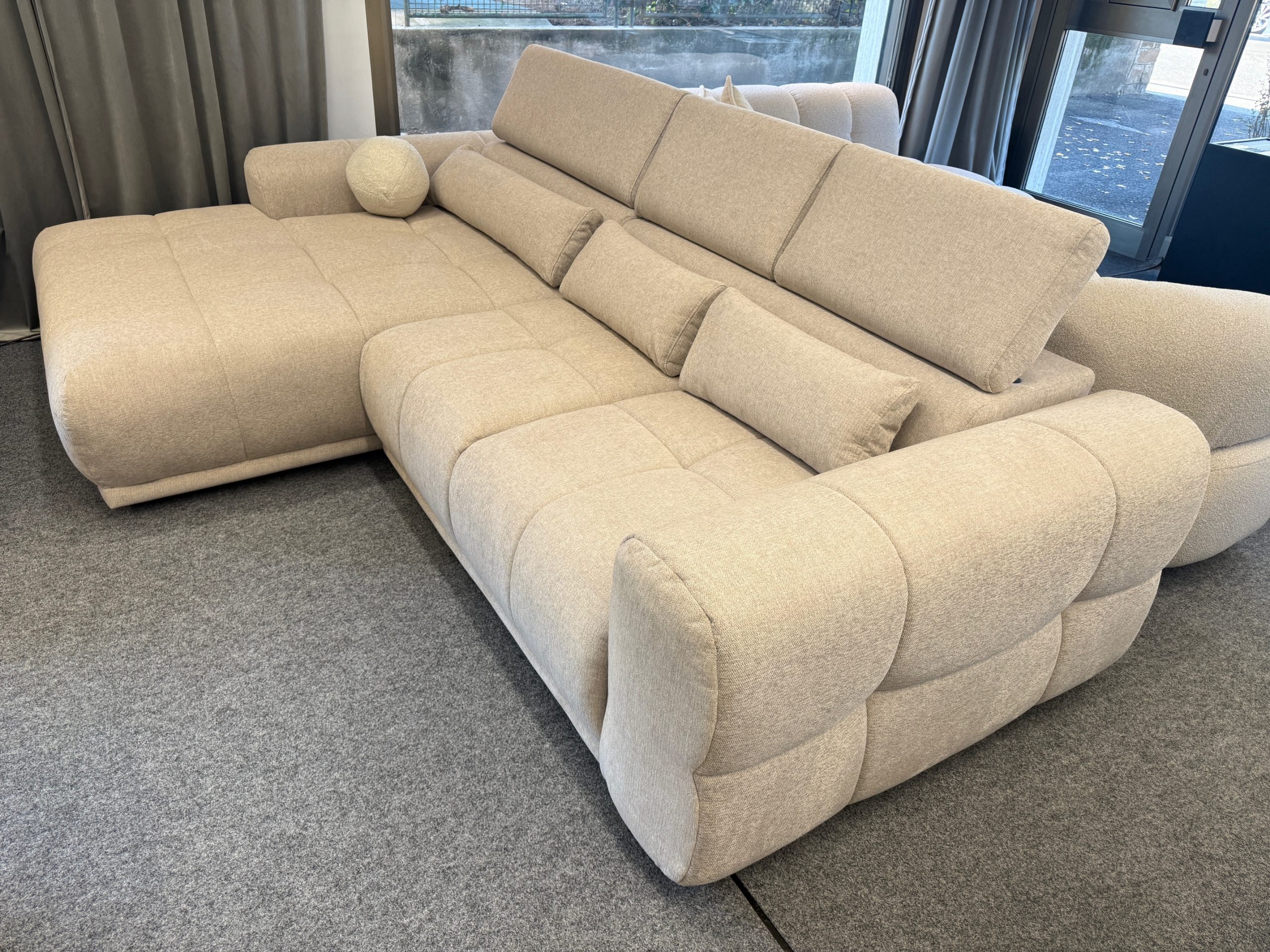 Questo modello, nella versione con penisola sinistra, è disponibile subito in showroom nel raffinato colore beige, facile da abbinare a qualsiasi stile di arredamento – dal moderno al tradizionale.