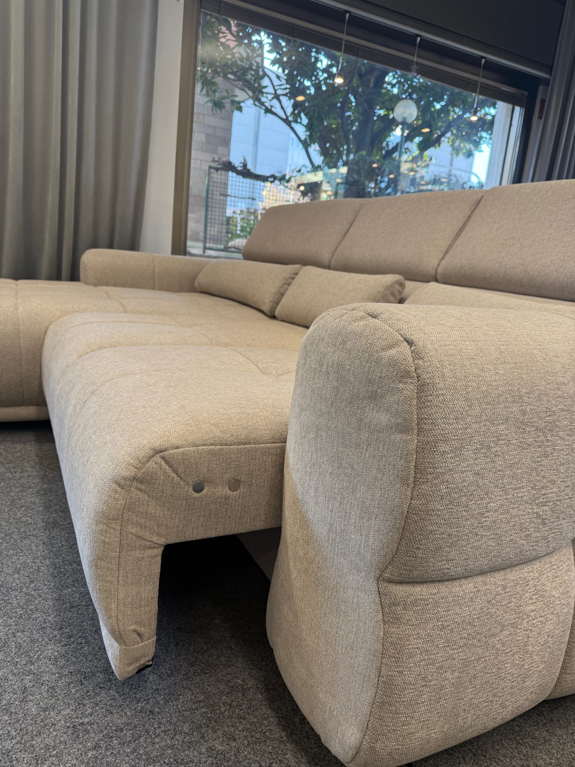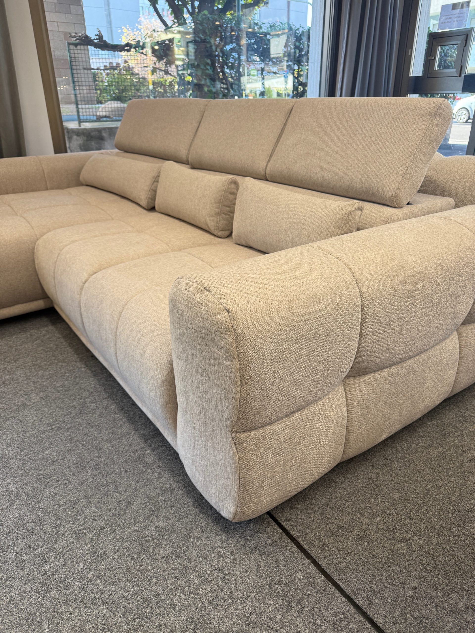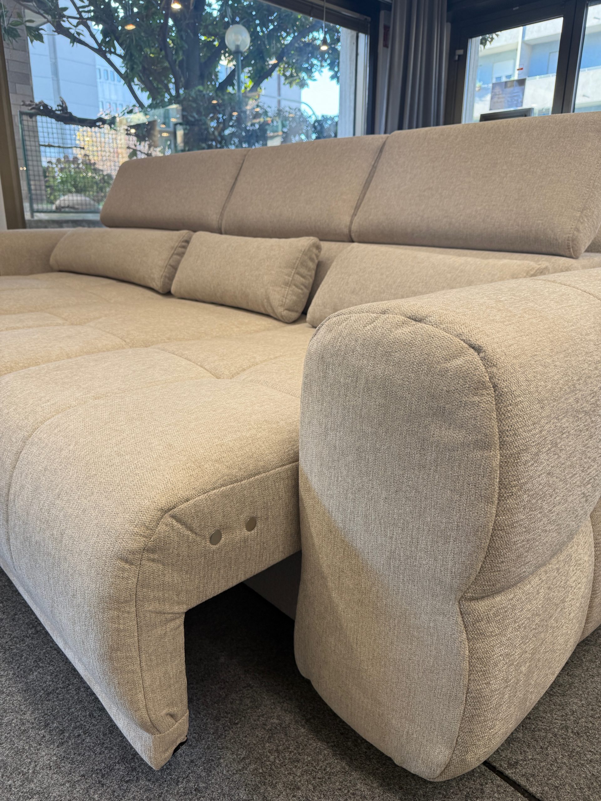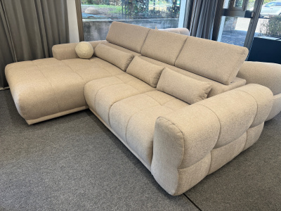 Questo modello, nella versione con penisola sinistra, è disponibile subito in showroom nel raffinato colore beige, facile da abbinare a qualsiasi stile di arredamento – dal moderno al tradizionale.