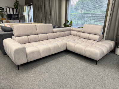🇩🇪 Ecksofa Plaza L – sofort verfügbar im Showroom, mit rechter Ottomane und edlem Stoff in Silber-Grau
