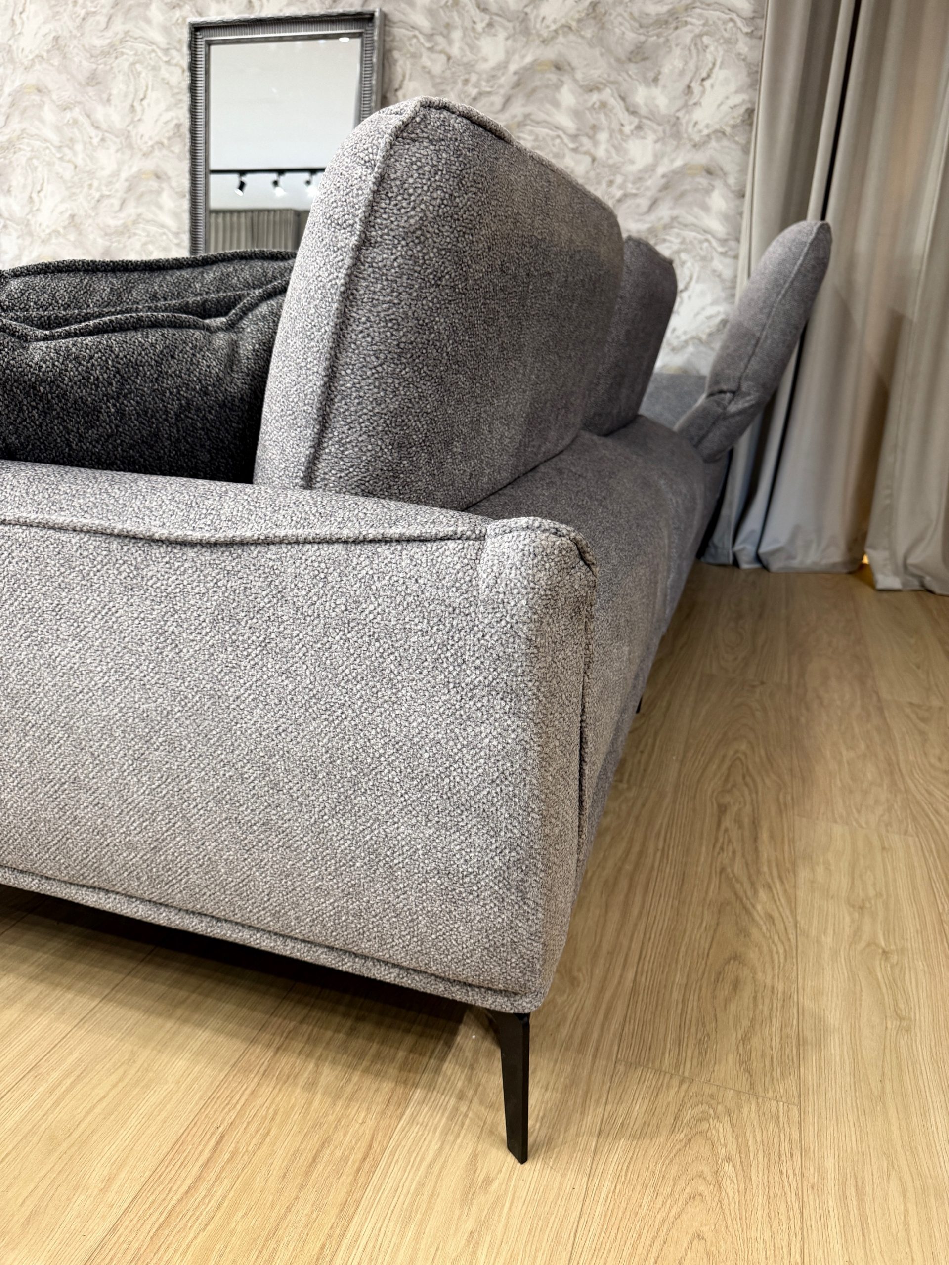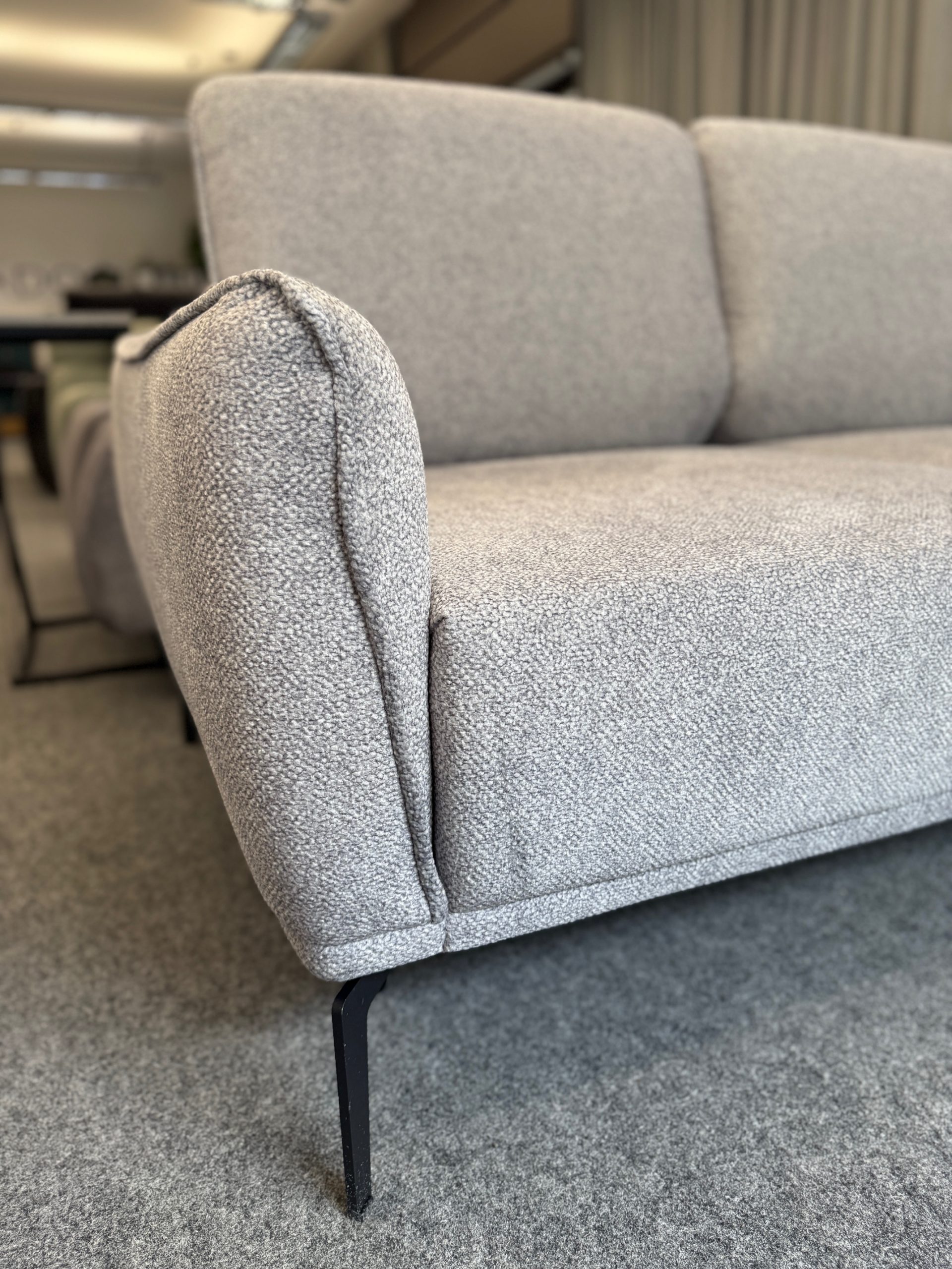 Questo modello, rivestito in un’elegante tessuto bouclé grigio, presenta una struttura a effetto granulare ma liscia al tatto, resistente e pratica, che non si impiglia e mantiene nel tempo la sua bellezza naturale.