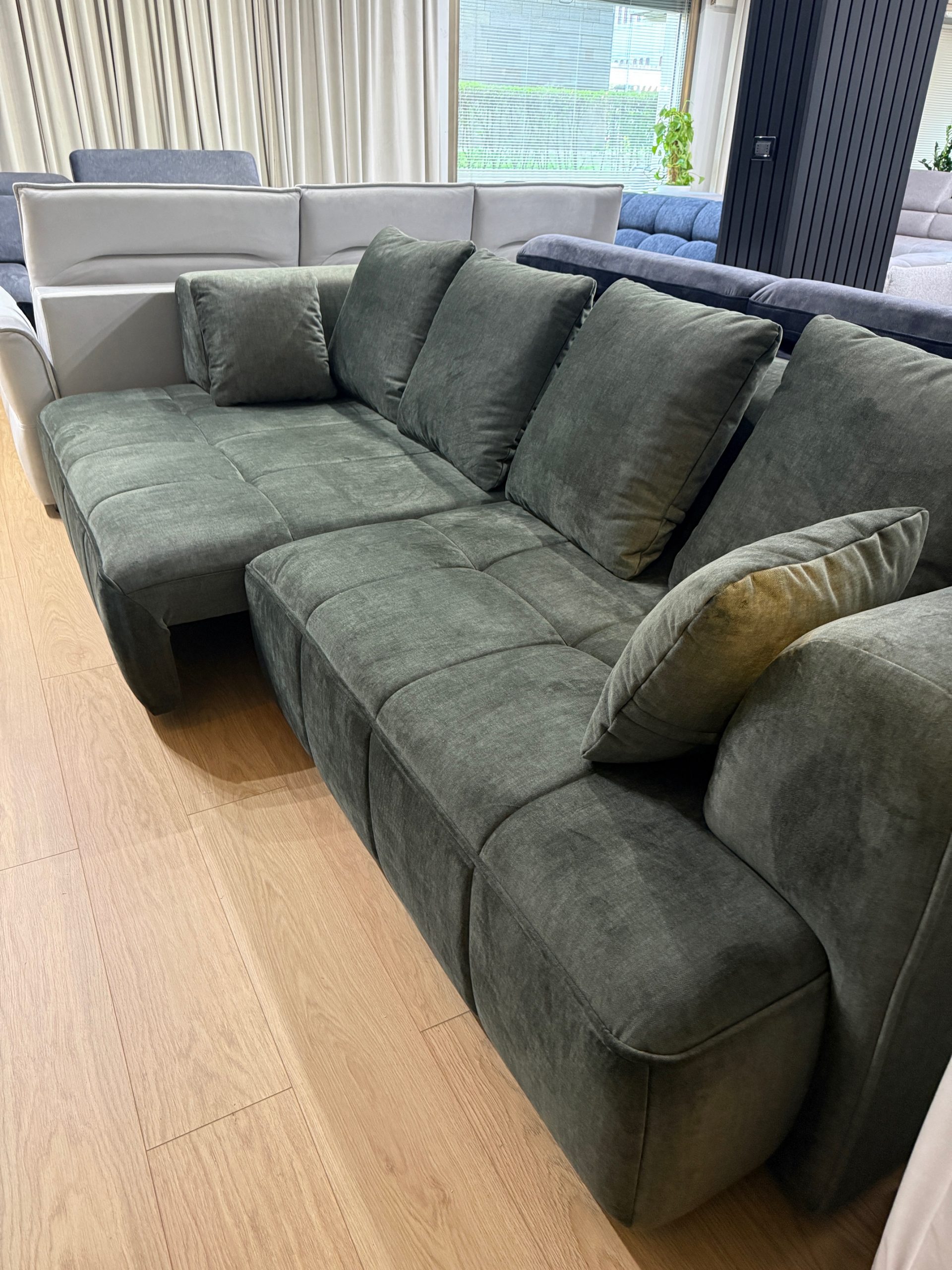 Il divano lineare Albio è una perfetta combinazione di design moderno, comfort quotidiano e materiali di alta qualità. Questo modello è disponibile subito e rivestito in un elegante tessuto tecnico color verde bosco, una tonalità raffinata che dona carattere e calore al soggiorno.