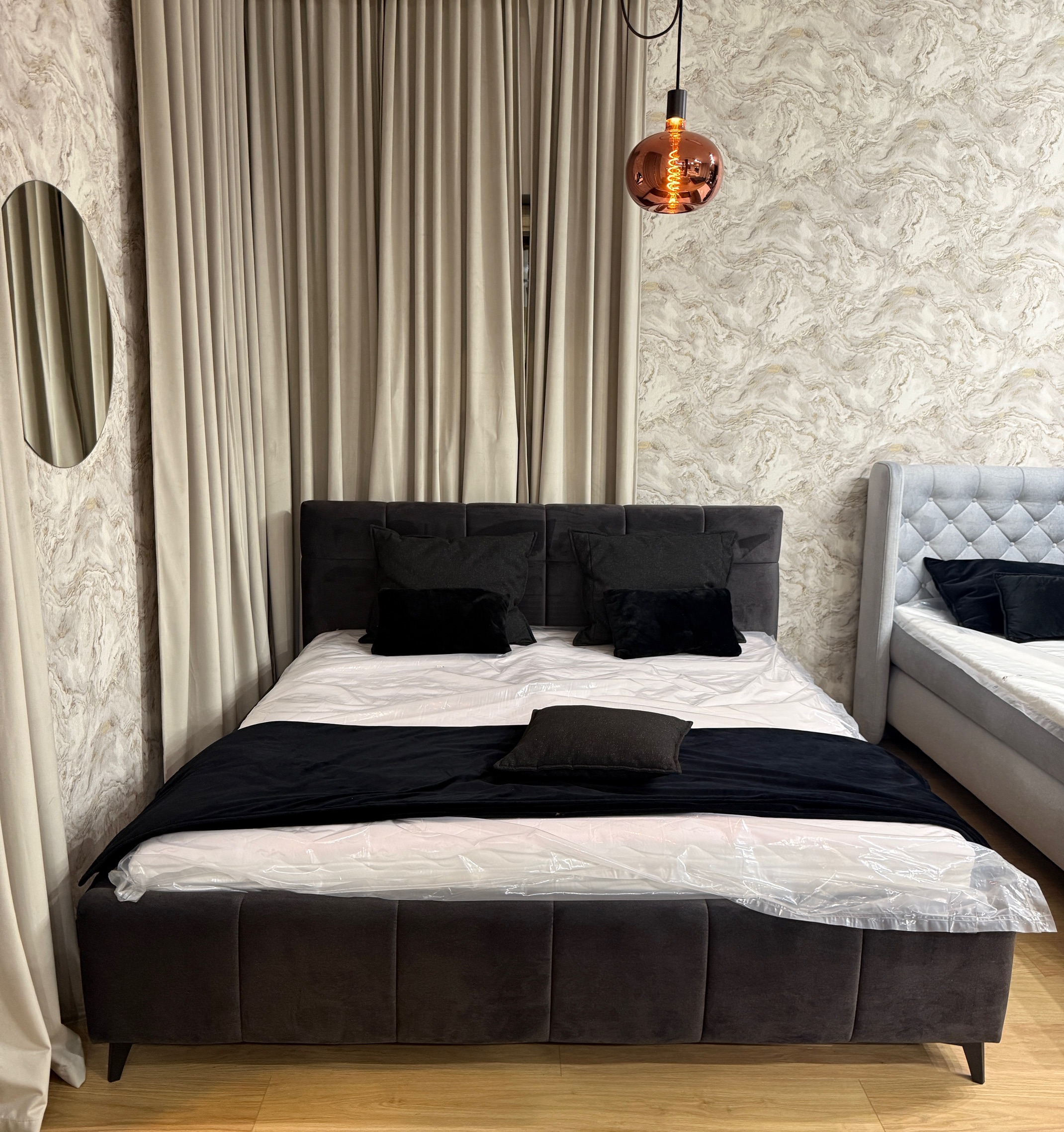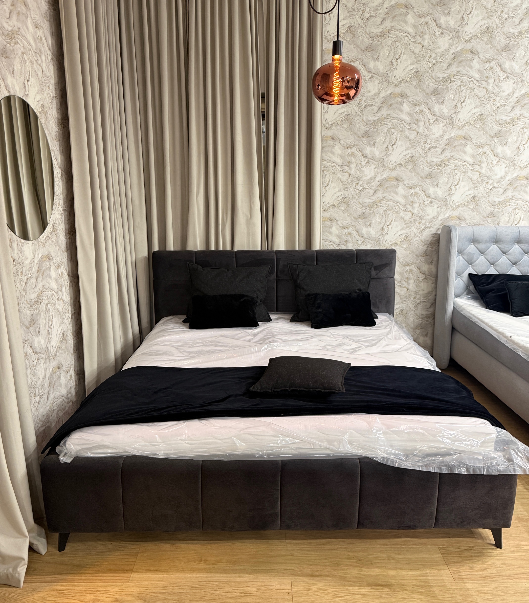 Il letto Naomi è rivestito in un tessuto antracite moderno ed elegante, morbido al tatto e facile da pulire, perfetto per l’uso quotidiano. La struttura è sollevata su pratici piedini, che alleggeriscono visivamente il letto e facilitano la pulizia sotto la base.